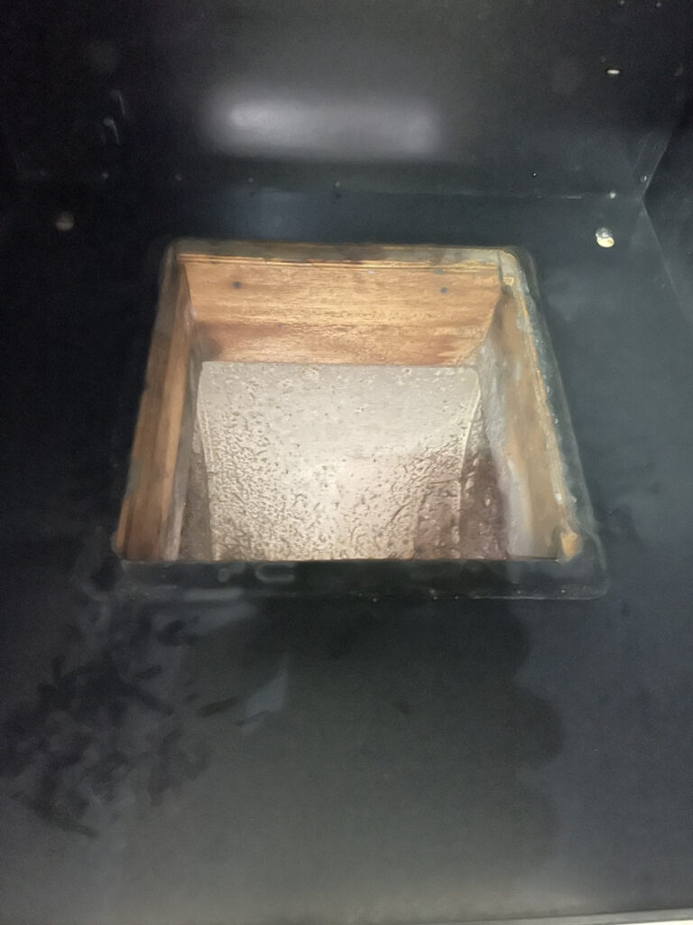 【写真②(IMG_2228.jpeg):既存の換気扇を完全に撤去し、木枠の開口部が露出した状態。】
