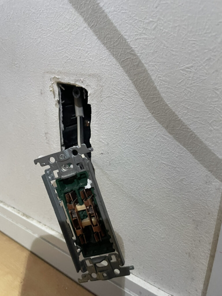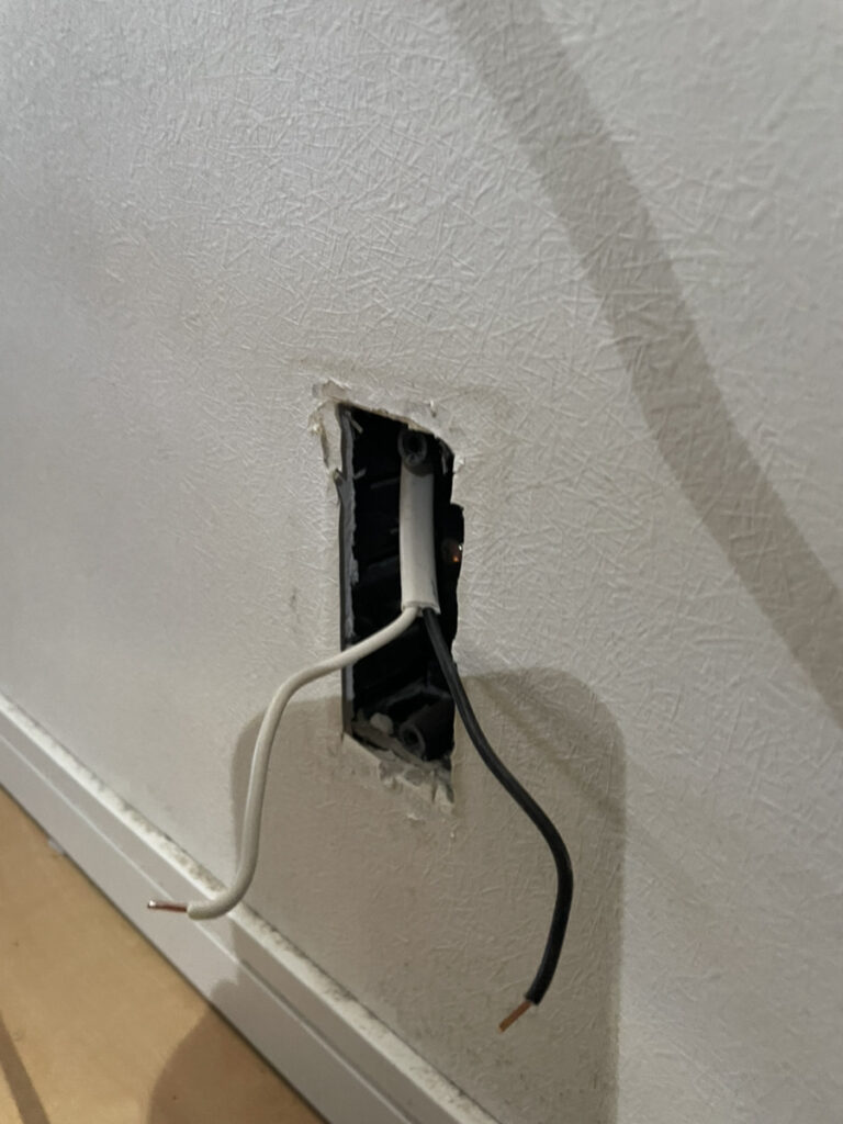 【写真①(IMG_2118.jpg):壁面から取り外された古いコンセント。配線が露出している状態。】